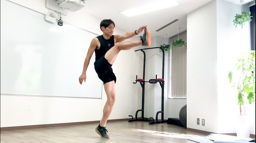 - 足を大きく振り上げ、つま先を交互にタッチします。