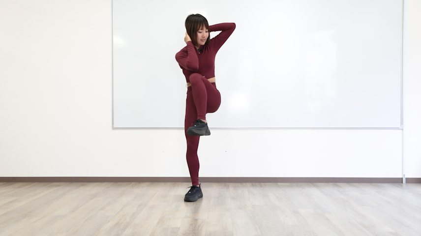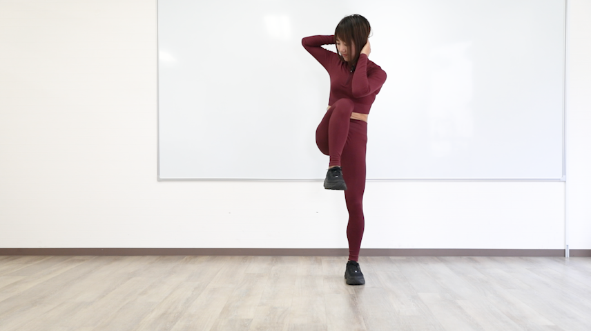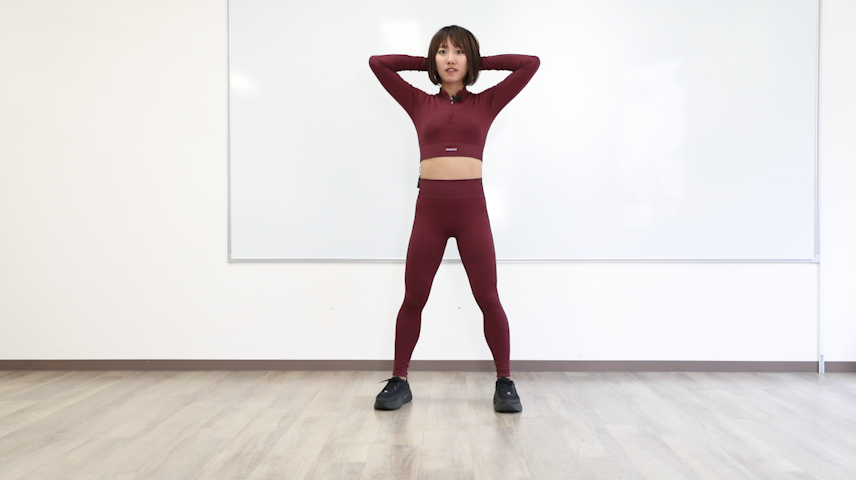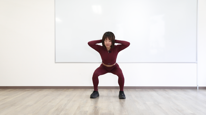 - そのあと、スクワットを行い、今度は逆側のヒジとひざをくっつけます。