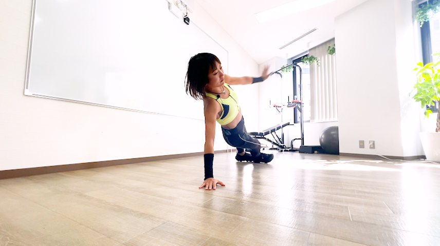 プランクのなかでもハードな部類に入る『ローリングプランク』。体を横に回転させながらノーマルプランクとリバースプランクの体勢を交互に行います。一般的な“静”のプランクに対して、こちらは“動”のプランク。動きながら鍛えることで、さまざまなスポーツで使える体幹が養われます。