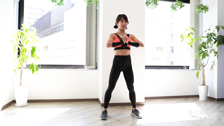 1.足を肩幅に開き、腕は前に手を伸すか、胸の前あたりで組む