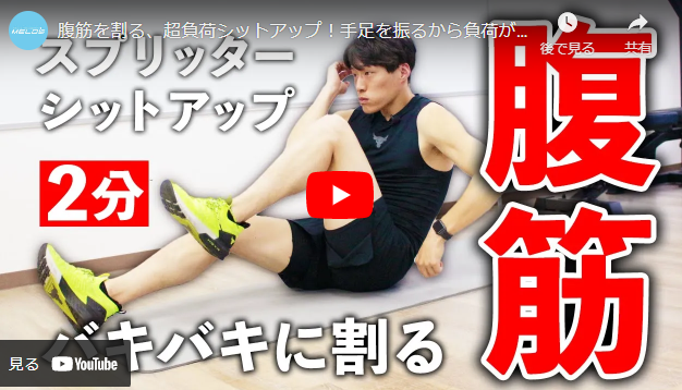 今回はお腹の筋肉、腹直筋を追い込む「スプリンターシットアップ」をご紹介。仰向けで寝転がった姿勢から、手足を使って走るようなポーズで体を起こします。通常のシットアップよりも負荷が高く、腹筋をしっかり追い込んで割りたい方に、特におすすめです。座る位置ににタオルやマットを敷いて行うと、お尻を痛めにくくなります。一緒に最後まで頑張っていきましょう。