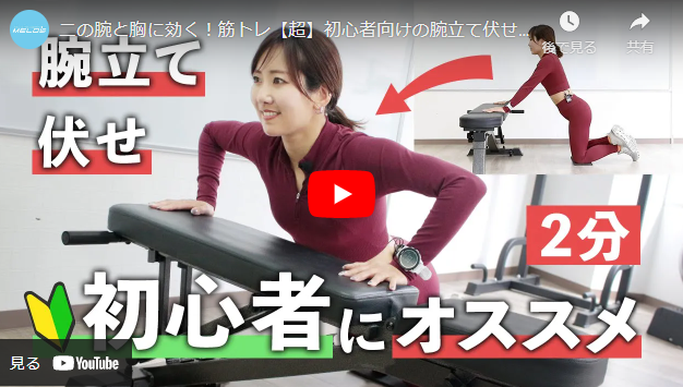 今回は、「膝つきイス腕立て伏せ」をご紹介。膝を床につけ、イスなどの高さのあるものを使って行います。通常の腕伏せがキツすぎると感じる方に、特におすすめです。胸と腕の筋肉を中心に刺激が入ります。一緒に頑張っていきましょう。