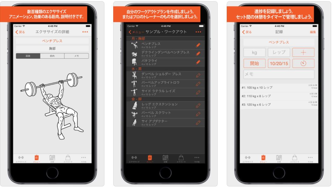 有料バージョンではさらに「記録内容のグラフ化」「iCloudのバックアップ」といった幅広い管理が行えるほか、アニメーション画像を用いた数百種類のエクササイズが閲覧可能に。トレーニングメニューの作成から記録・管理、さらには実際のトレーニングまで、このアプリ1つさえあれば困ることはありません。