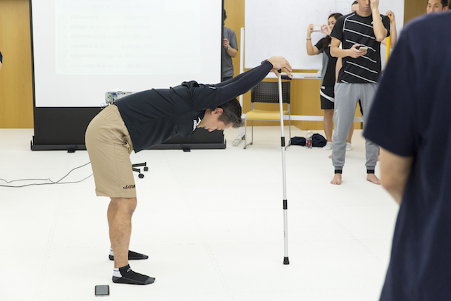 「身体の動きの幅をどうとらえるか、コンディショニングの評価と実施を体験してみましょう。まず、<ストリームラインストレッチ>から始めていきます。これは背部・胸郭・肩甲骨可動域を評価します。バーを身体正面に立て、手の間に頭を入れ身体を伸ばし、真横から静止画で撮影してください。自分がどこまで肩を入れられているのか、腰の位置はどうかなどをチェックします。バーがなければ壁を代用してもOKです」(桑井さん)