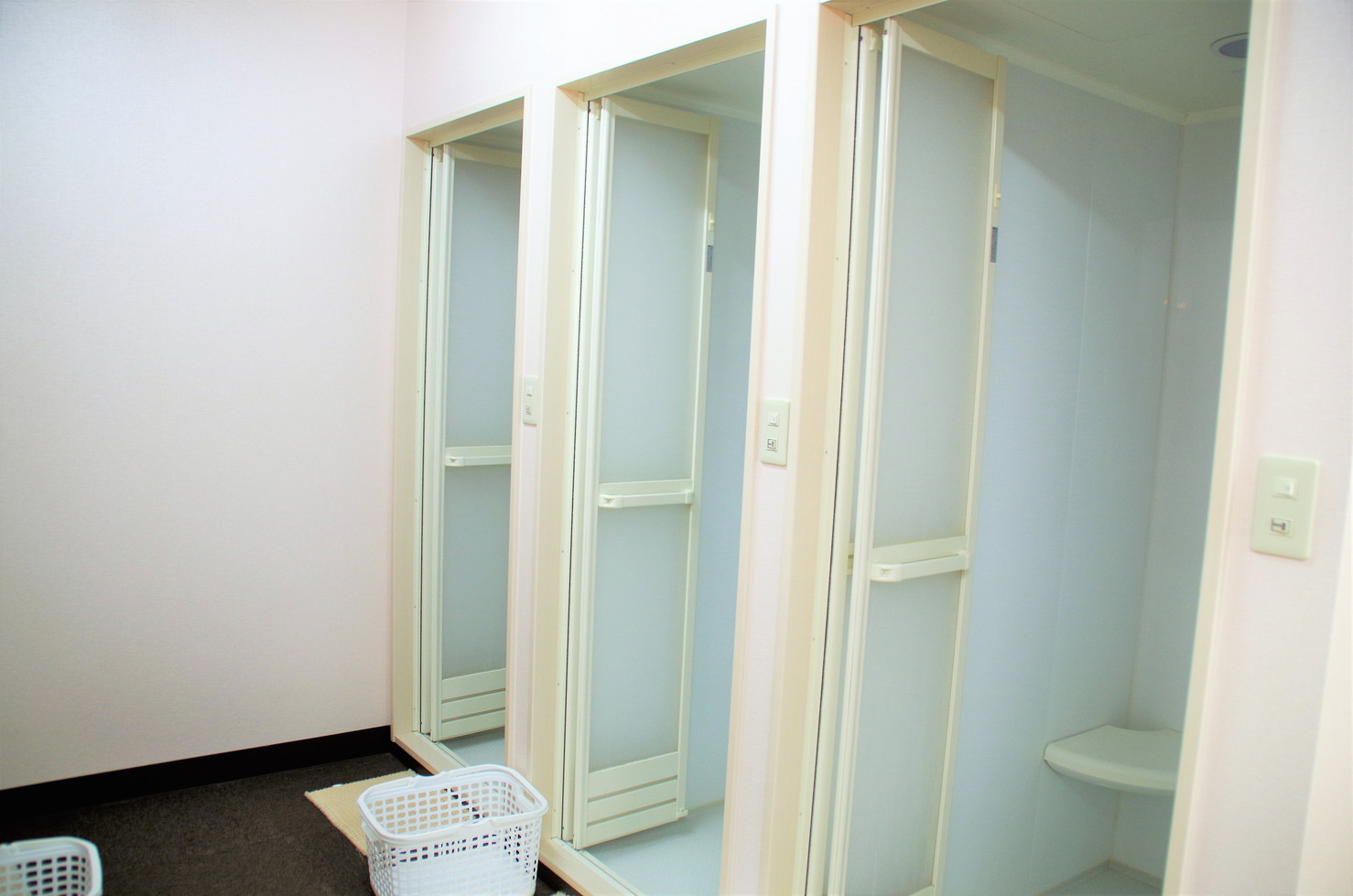 シャワーは6か所。シャンプーなどはもちろん備えつけですが、シャワー室には椅子もありました。走って疲れた後、立って身体を洗うのが大変……という方でも安心です。
