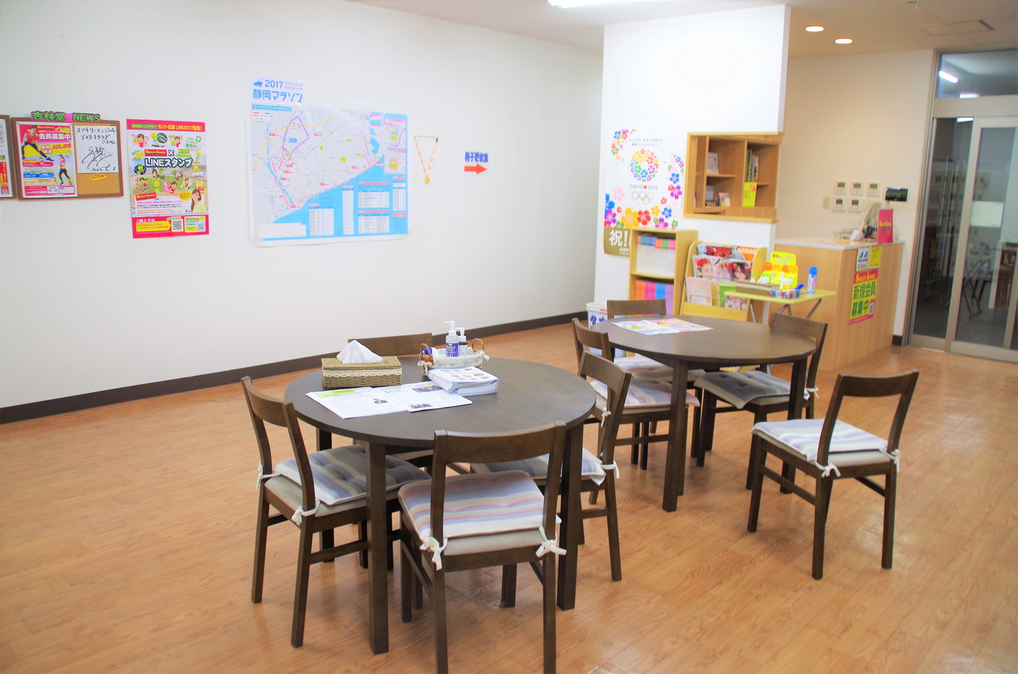入口を入ると広いスペースがあり、2つのテーブルが置かれています。着替えを済ませて仲間を待ったり、ランニング後に休憩したり。まさに利用者にとって憩いのスペースといえるのではないでしょうか。