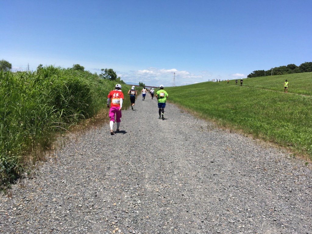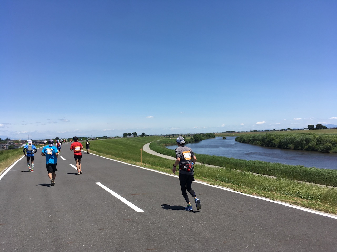 青空が広がり、天候に恵まれた柴又100K。前半は強風、後半は暑さに悩まされるシーンもありましたが、全体を通じてとても気持ちよく走れました。折り返しコースということで、他ランナーに途中で会えるのも楽しみの1つではないでしょうか。往路では、一足先に折り返して戻ってきたトップランナーの走りを見ることができました。