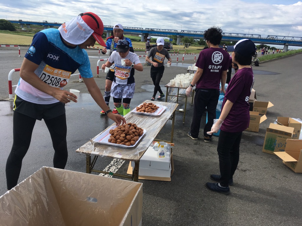 マラソン大会でチェックして起きたいのがエイドステーション。特に100kmという長丁場では、エネルギー切れを起こさないための補給、そして脱水や熱中症などを防ぐための給水が重要です。