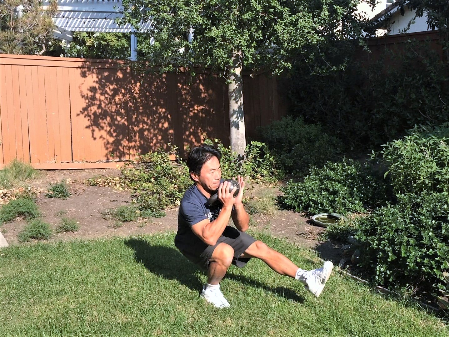ケトルベルを両手で胸の前に抱え、スクワットをします。