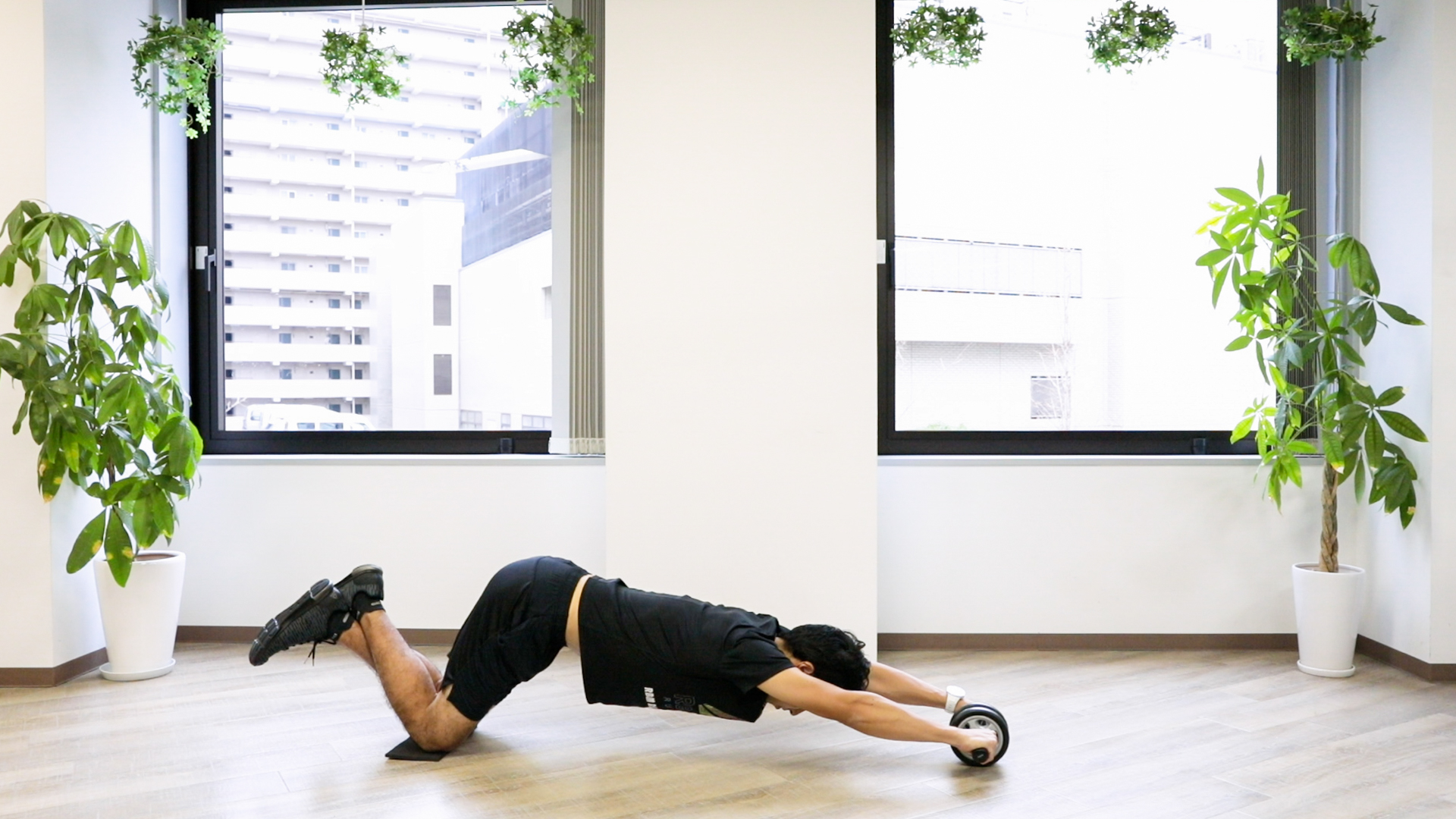 ローラーを引き戻すのは初心者だと難しいので、ローラーを前に転がした後は、そのまま前や横に倒れ込んでも問題ありません。