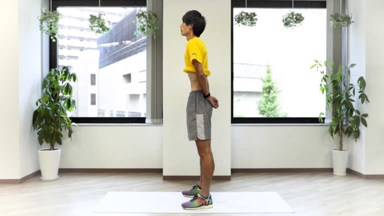 - 足を肩幅に広げ、背筋を伸ばして立つ