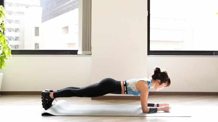 お尻を下げたとき、地面スレスレでキープさせることで筋トレ効果もアップ。慣れてきたらお腹にダンベルや重りを乗せて負荷を高めましょう。