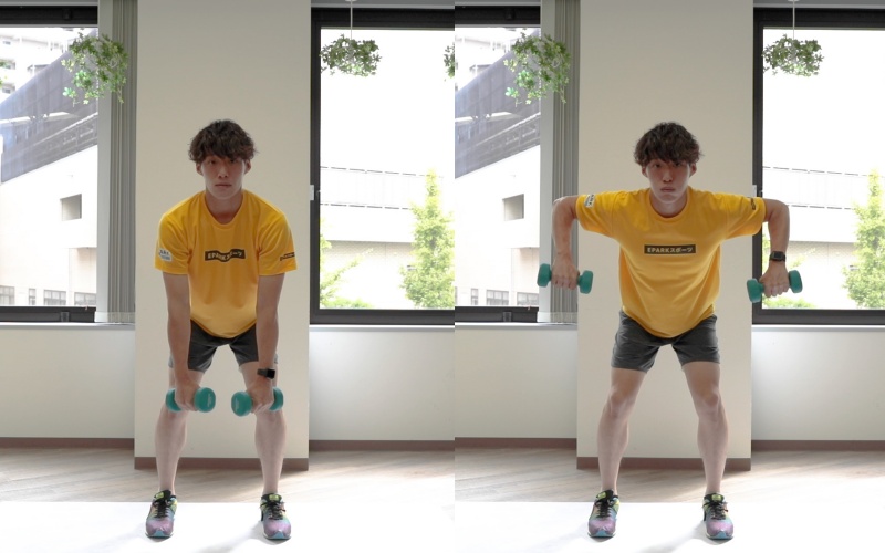 - 肩の高さまで持ち上げたら、ゆっくりと元の姿勢に戻る