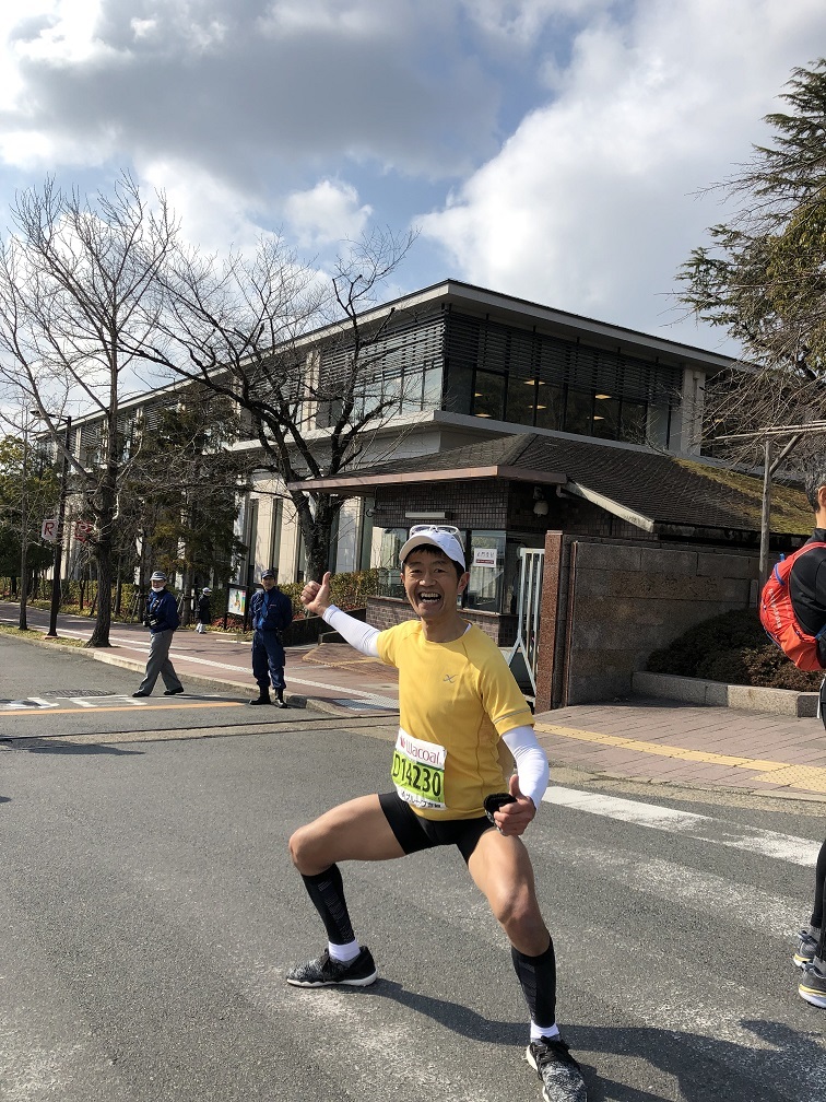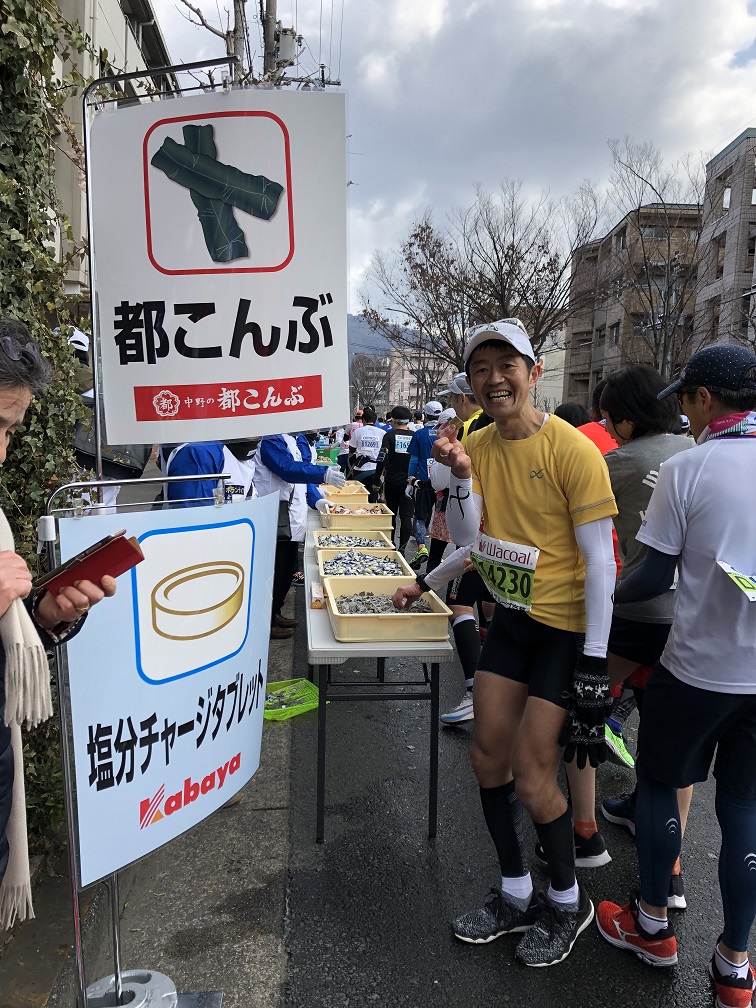 20数年前の校舎も、随分と見ないうちに綺麗に模様替えされたようで、整備された正門の前で記念撮影を終え、近くの給水所で、私に水を渡してくれたスタッフは、何と、私の20数年下級生にあたる後輩。アラフィフ目前の私に、「先輩、頑張ってー!」の大声援、ちょっぴり恥ずかしさを感じつつ、何とも微笑ましい声援は、単調な賀茂川沿いロードに向け、たくさんの元気をもらったことは、間違いありません。