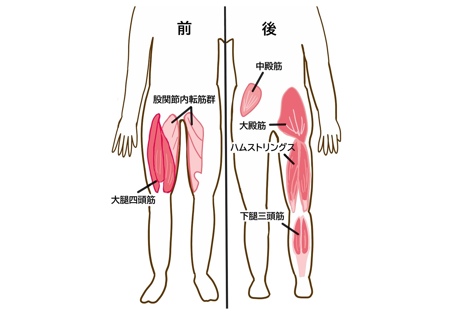 太ももの裏に位置し、股関節の動きや走行時の加速に重要な役割を果たします。大臀筋と同時に鍛えることで、姿勢改善やケガ予防にも効果があります。