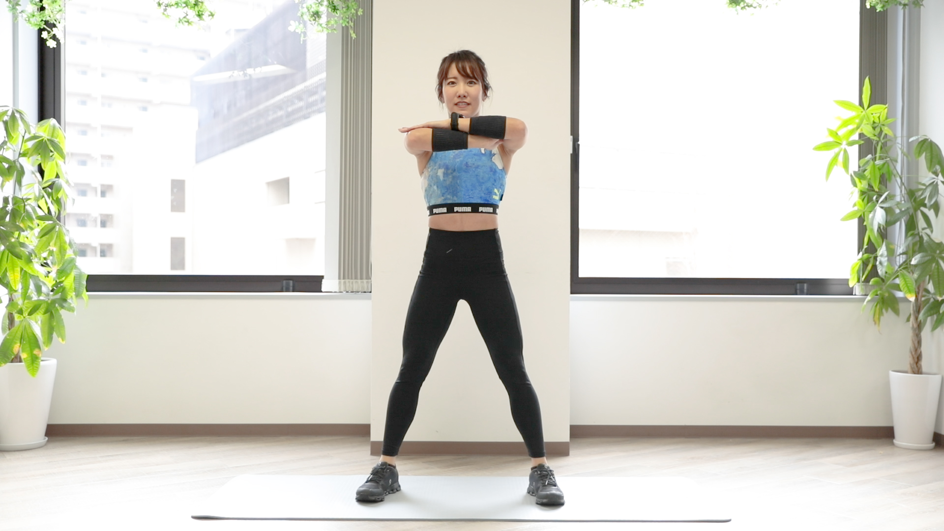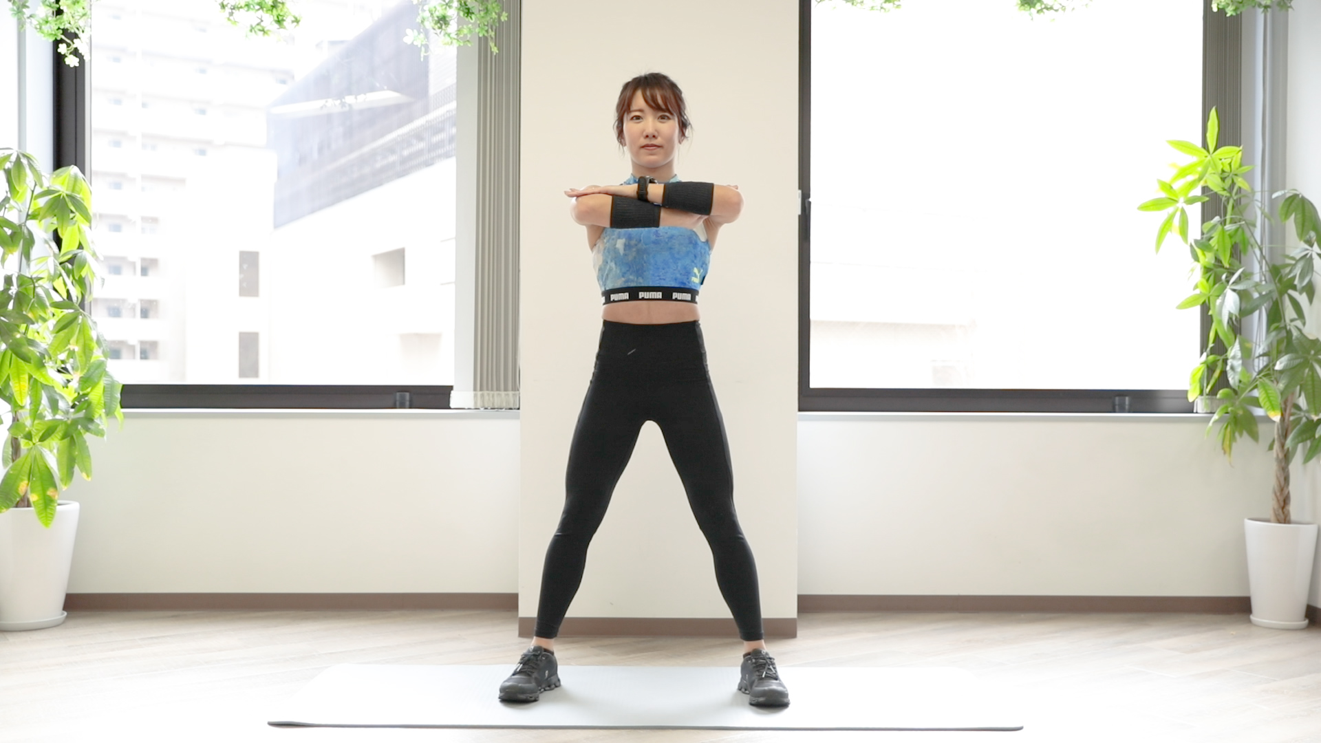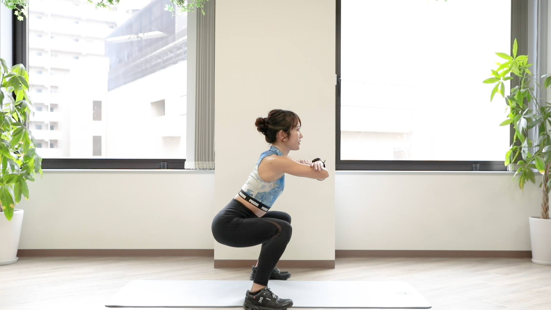 3.太ももが床と平行になるまで下ろしたら、ゆっくりと元の姿勢に戻る