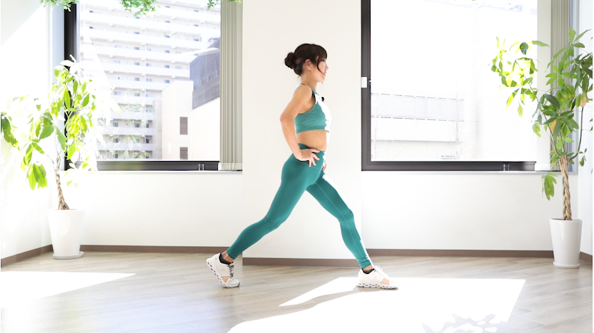 足を前後に大きく開いて行う種目。前足だけでなく後ろ足にも刺激が入り、バランス力の向上や下半身全体の強化につながります。ランジに似ていますが、後ろ足を意識するのがポイントです。