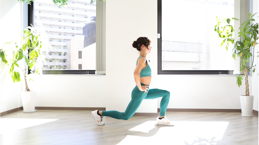 3.背筋を伸ばし、ゆっくりと前方の脚を曲げていく。