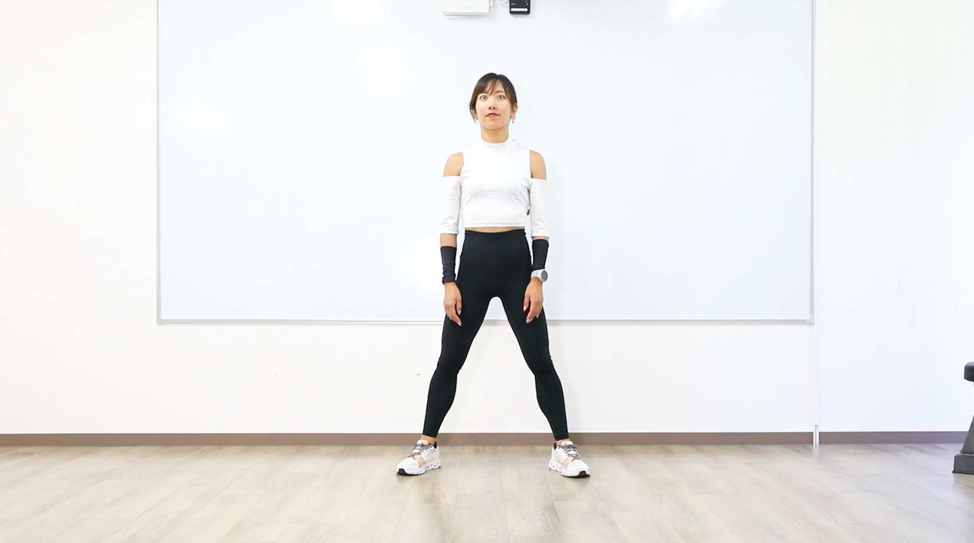 1.足を腰幅より広く開き、つま先は30°程度外向きにする