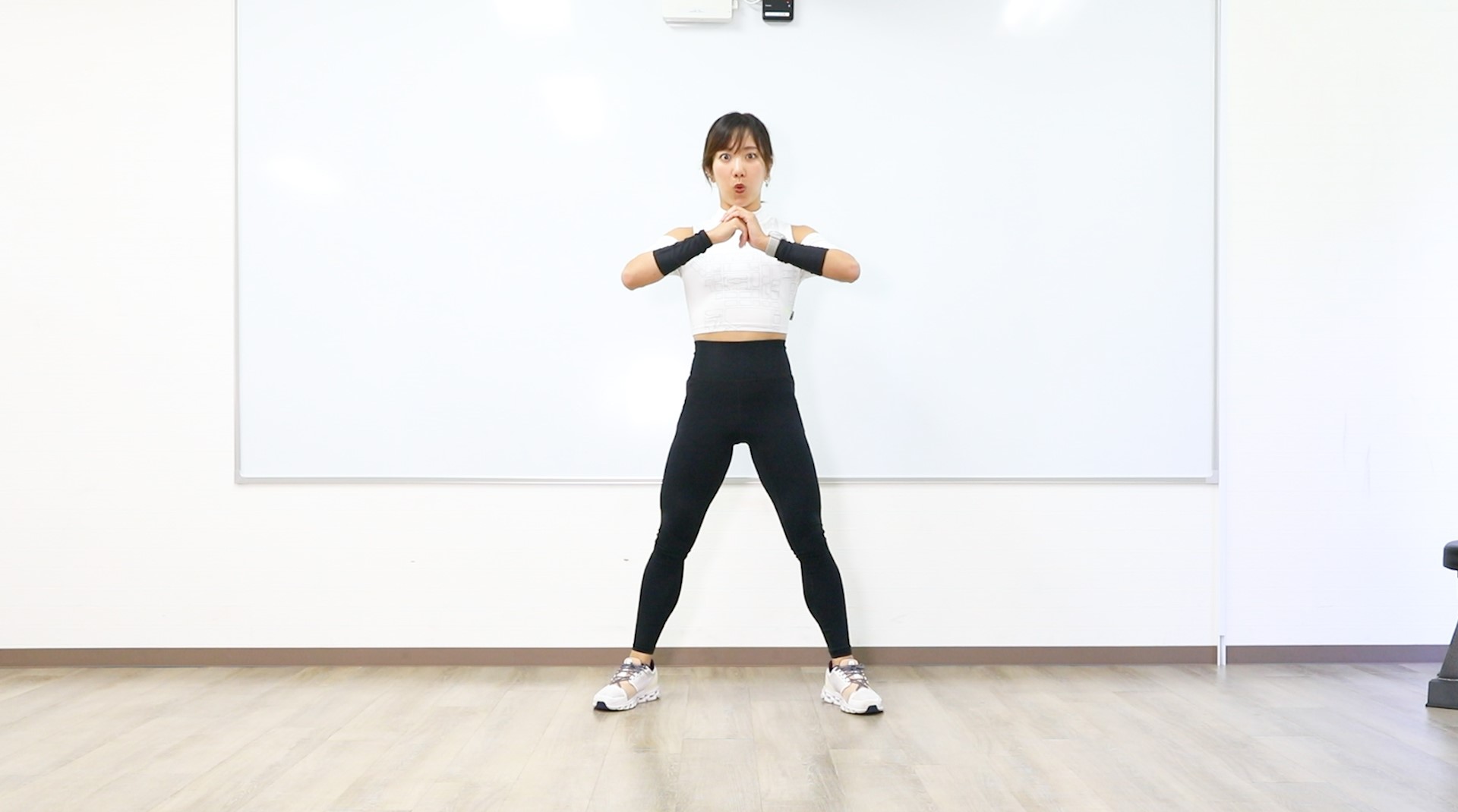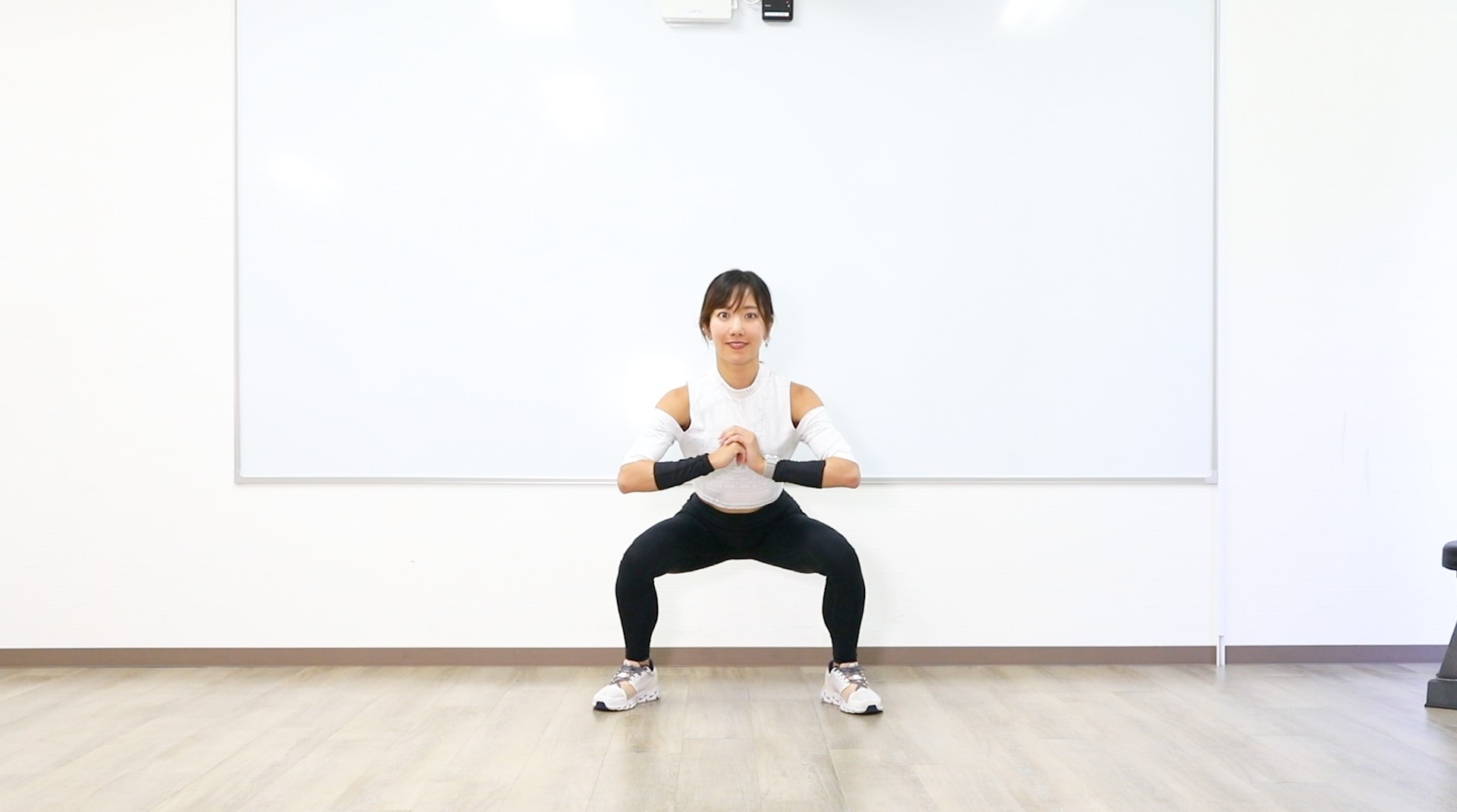 足を大きく開き、つま先を外に向けてしゃがむ動作。内もも(内転筋)や股関節まわり、中殿筋を強化でき、ヒップラインの引き締めに効果的です。スクワットが前太ももに効いてしまうという人にもおすすめです。