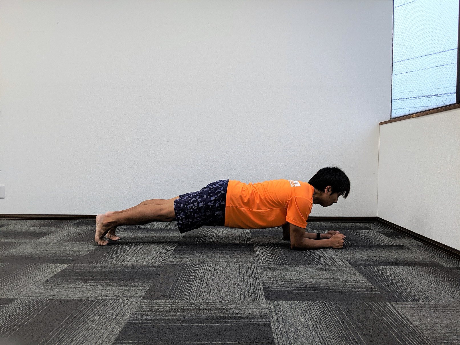 このとき、腰が曲がったり弓なりになったりせず、頭から足までが一直線上にあることが大切。