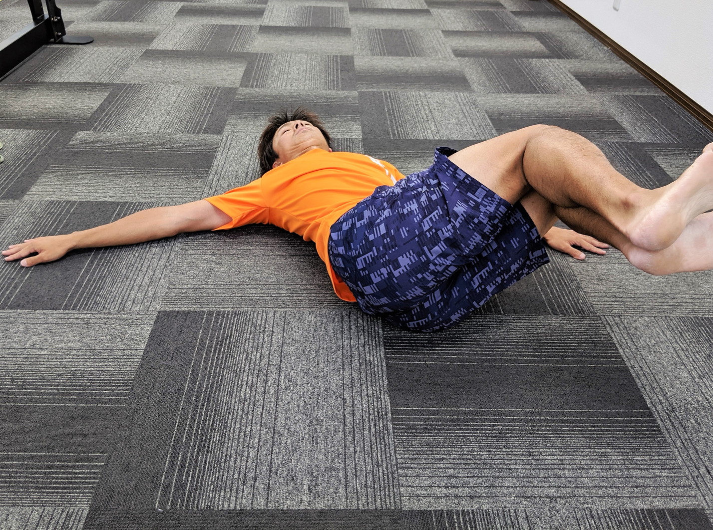 仰向けに寝転がった状態で下肢を横に捻ります。身体を安定させるため、両手は広げて床につけましょう。肩も床につけ、捻った際に浮かないよう取り組んでください。