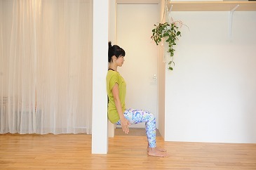 空気イスに座るようなイメージで膝が直角になるところまで腰を降ろしていきます。 お尻、肩甲骨、後頭部は壁につけておきます。 足幅は握りこぶし1個~腰幅 (狭い方がきついです)。