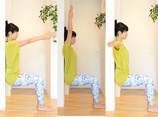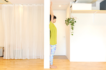 吸いながら両腕を下から上へ持ち上げて、吐きながら壁を触るように大きく回します。 肩が壁から離れないように気を付けましょう。3~5回くりかえします。