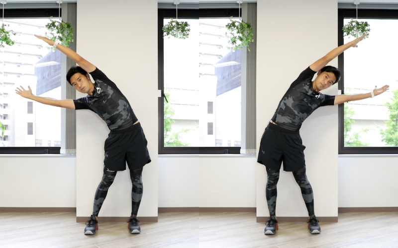 立った状態で腹斜筋を鍛えます。バンザイの姿勢から上体を左右に倒すトレーニングで、動作もシンプルなので運動不足の人にもおすすめです。
