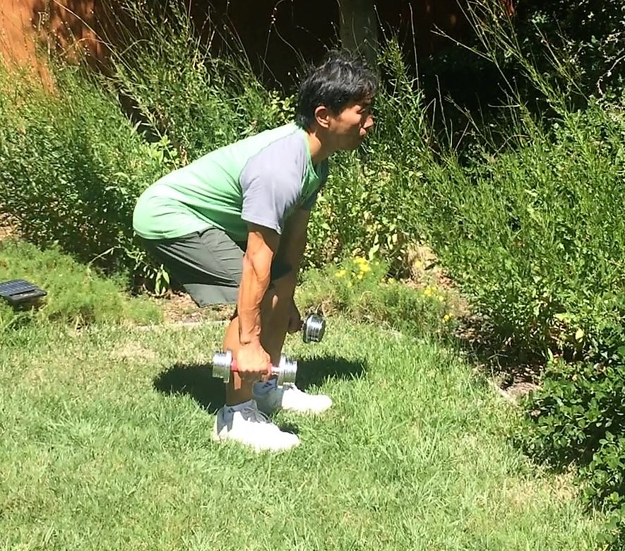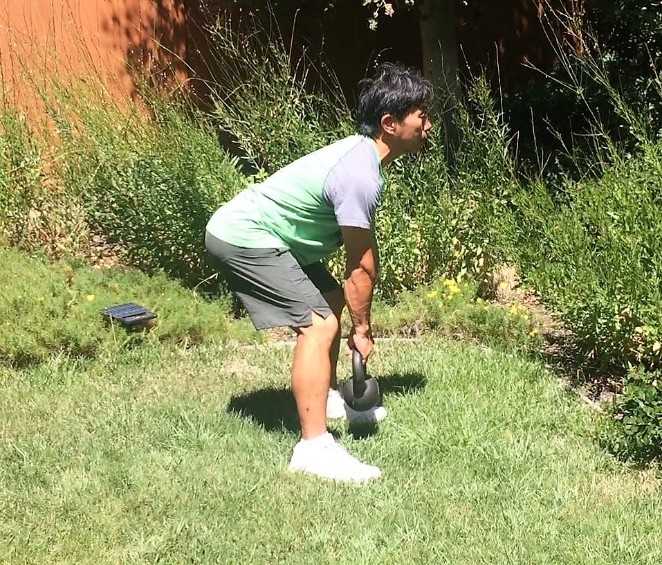 ケトルベルの代わりにダンベルを使っても構いませんが、その場合はダンベルを地面に着けず、上半身が過度に曲がらないようにします。