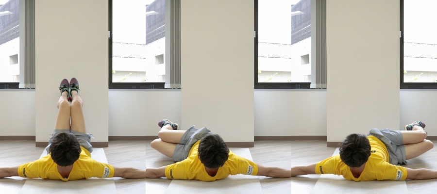 - 仰向けになり、手を横に広げ、足を軽く曲げて浮かせる