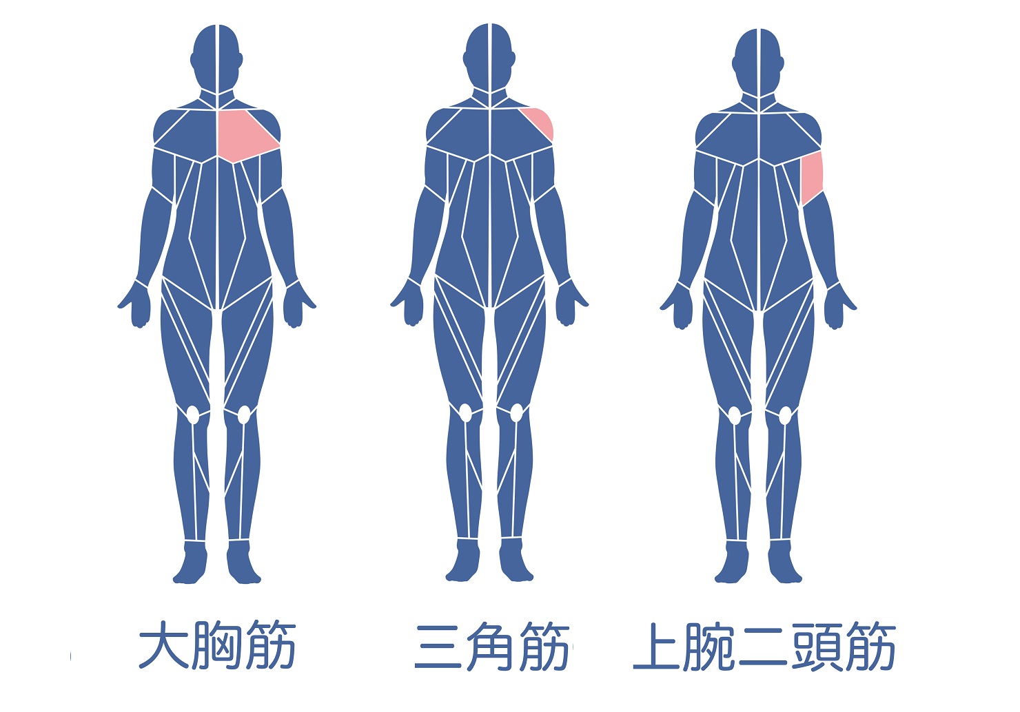 大胸筋(胸)をメインに、三角筋(肩)、上腕三頭筋(腕)などを同時に鍛えることができます。