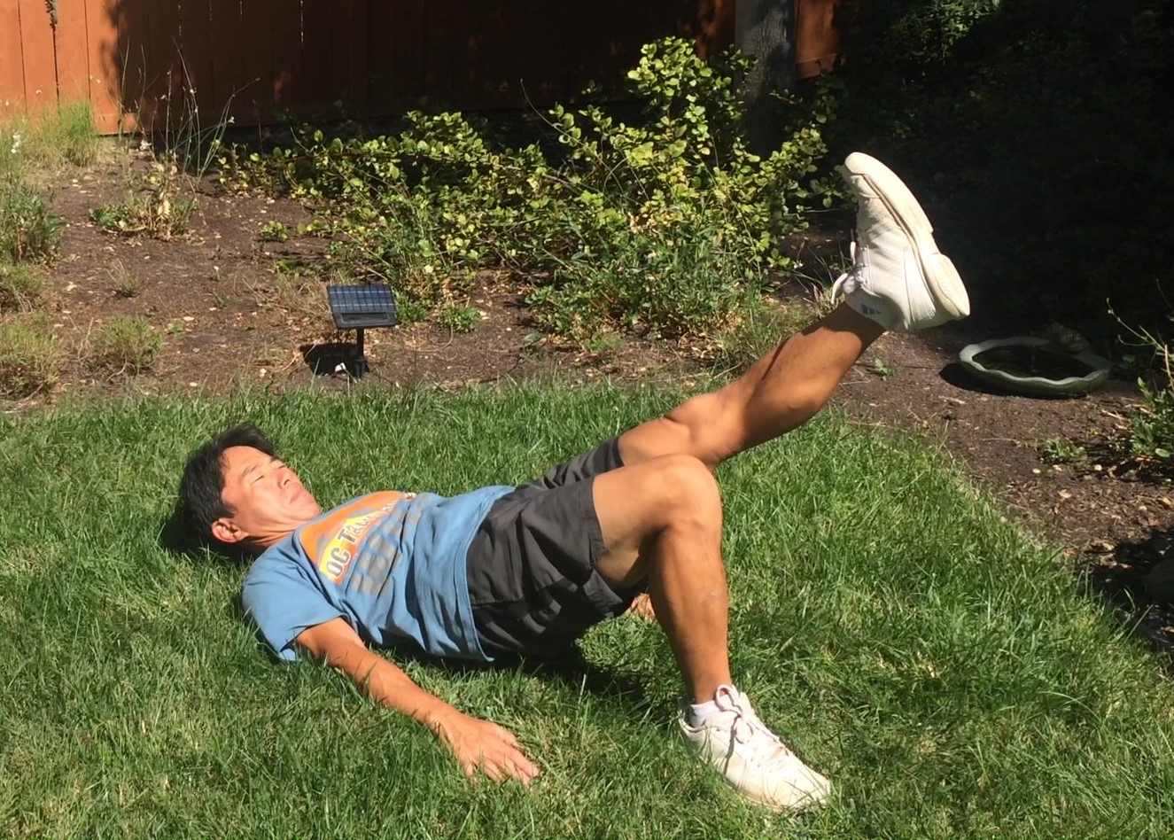 先述したグルート・ブリッジの状態から片足を伸ばして静止し、両膝は同じ高さに保ちます。