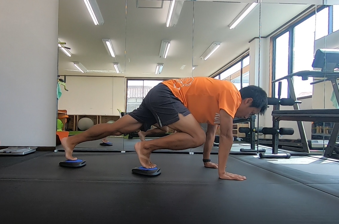スケートのように左右に身体を振りながら、足を滑らせて動くスライドボード。下肢を中心に筋肉を鍛えつつ、有酸素運動も行えます。うまく左右に滑るには重心移動に応じた姿勢維持が求められ、体幹トレーニングの効果も期待できるでしょう。最初のうちは、連続して滑るだけで難しいかもしれません。スライド・コア・トレーニングにも活用可能です。