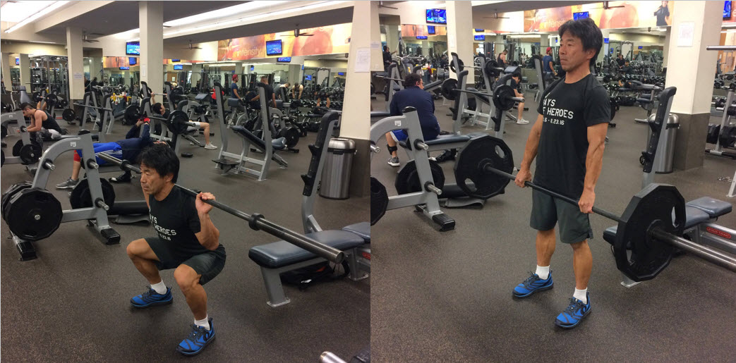 スクワットはバーベルを肩に担ぎ、一旦しゃがみ込んで立ち上がります。そしてデッドリフトは、床に置かれたバーベルを膝の上まで持ち上げます。