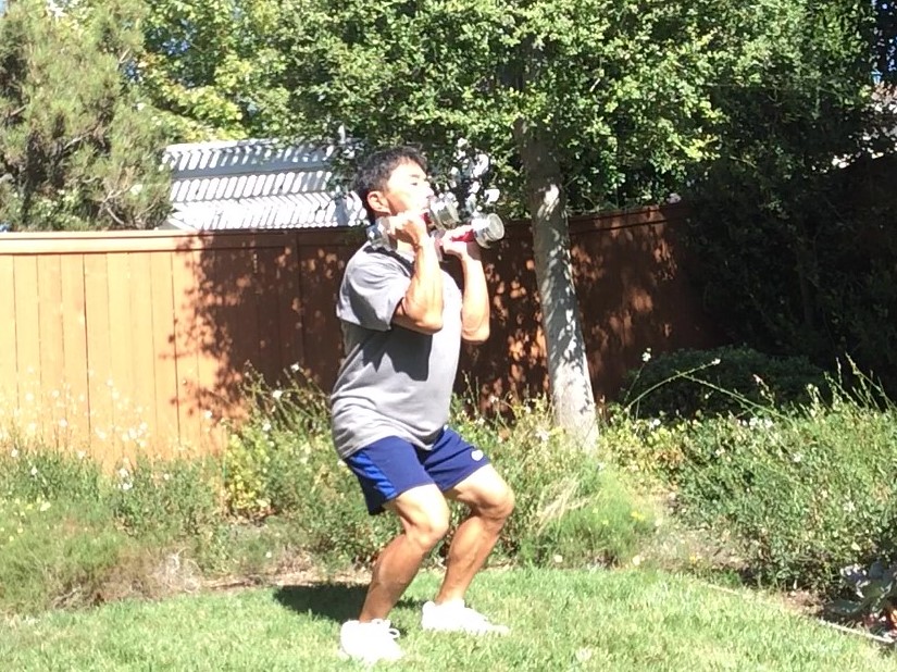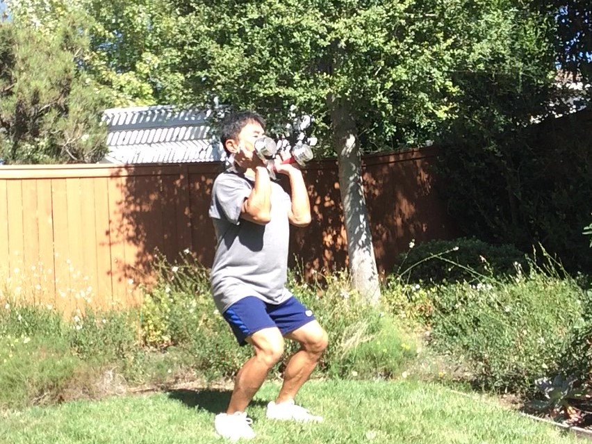 セットアップ(2回目):ダンベルを肩に担いだまま、膝と股関節を伸ばす。