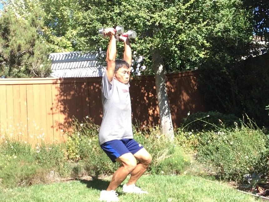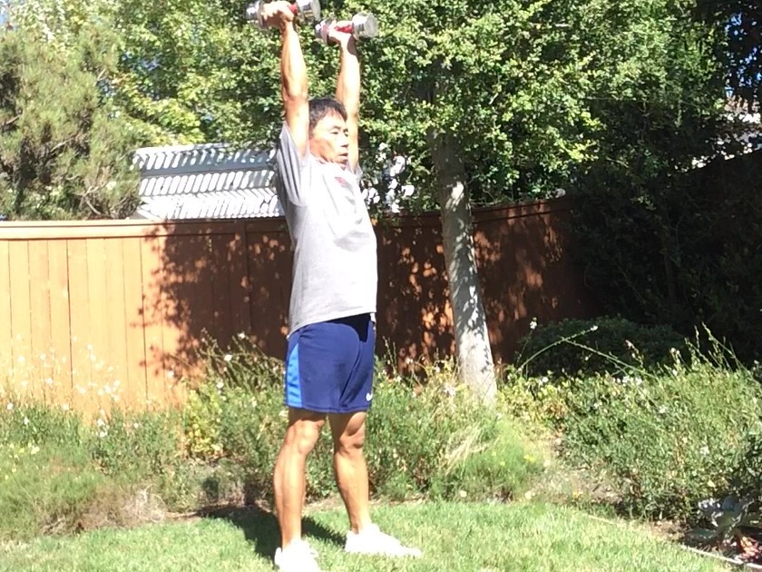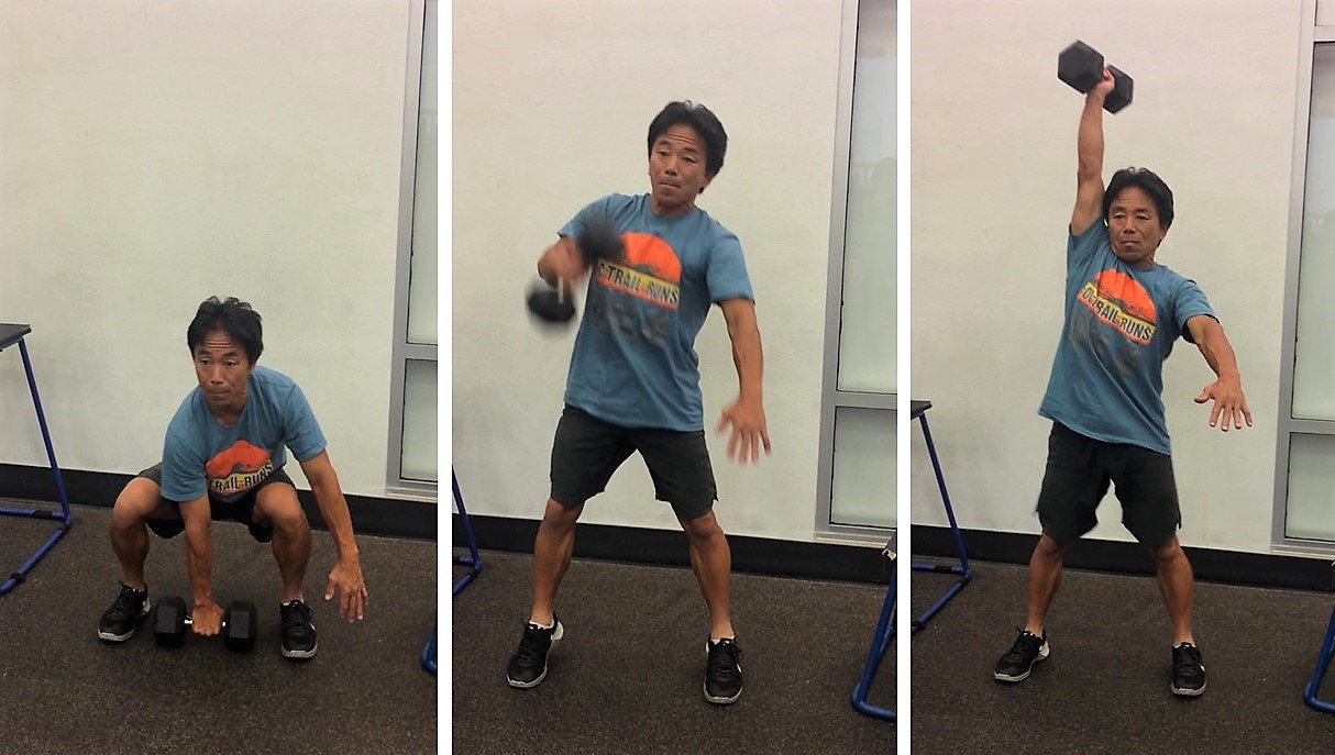 ドライブ(2回目):すばやく立ち上がり、膝と股関節を伸ばす。同時に腕を伸ばしダンベルを頭上に持ち上げる。