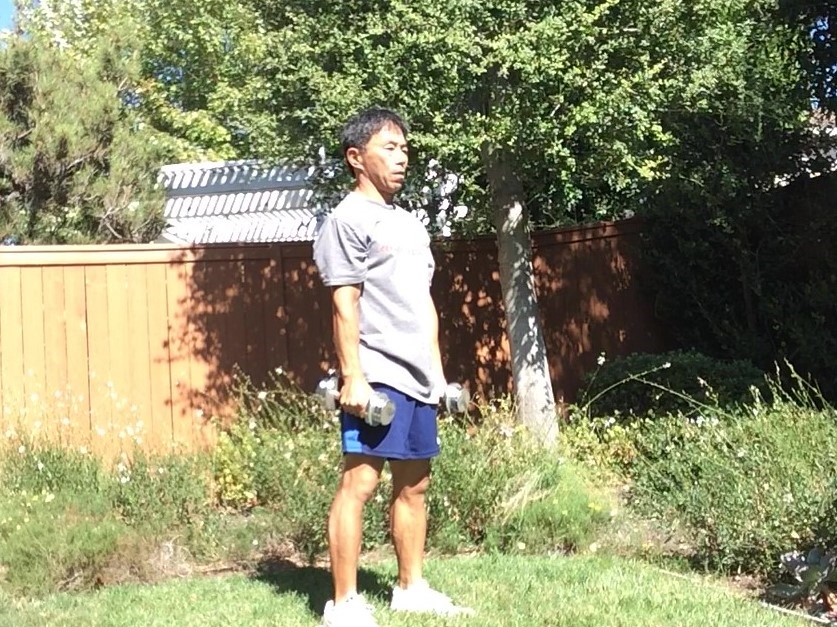 セットアップ:両足を肩幅ぐらいにして立ち、ダンベルを両手にぶら下げて持つ。両手は体の内側に向ける。