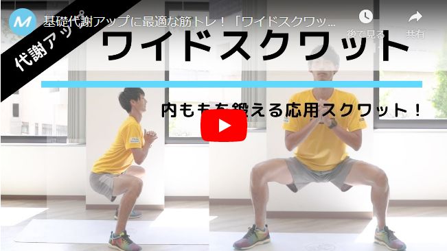 鍛えにくい筋肉のひとつである「内もも」が鍛えられる「ワイドスクワット」。筋力向上による基礎代謝のアップや、股関節の可動域を広げ、怪我予防にも効果的です。また、心肺機能の向上も期待できます。