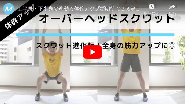 上半身と下半身をバランスよく鍛えられる「オーバーヘッドスクワット」。体幹部の姿勢維持機能が向上することで、全身を効率的にトレーニングすることができるメニューです。