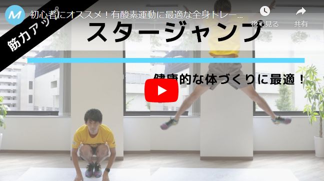 心肺機能や体力、持久力、筋力アップが期待できる全身トレーニング「スタージャンプ」。筋トレ前に有酸素運動を行なうウォーミングアップとしても人気のメニューです。