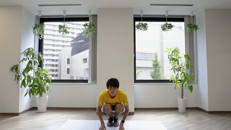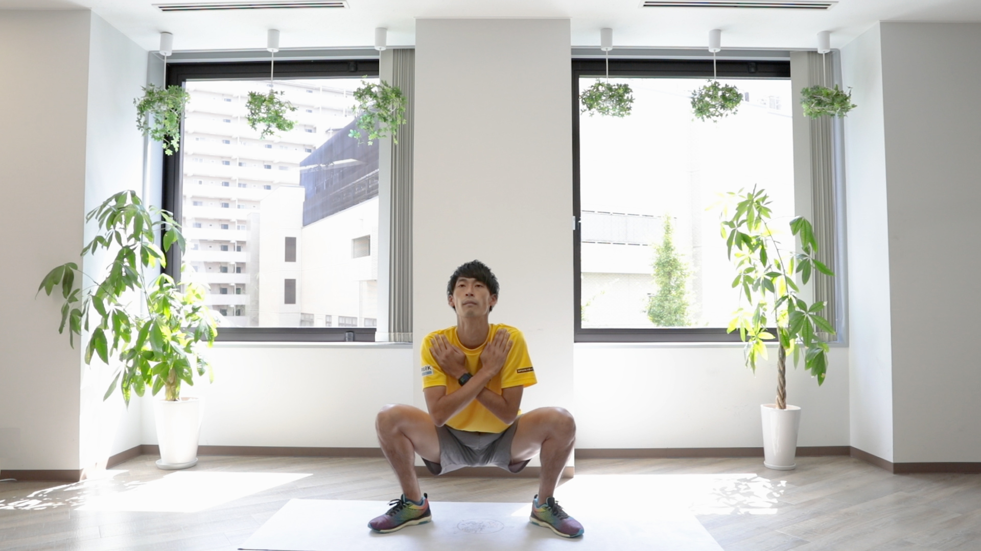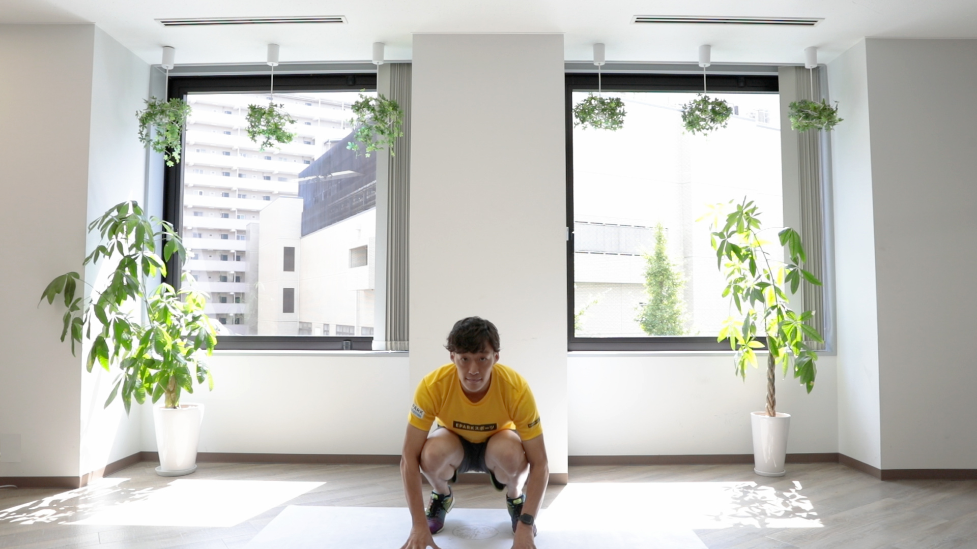 1. 足を肩幅に開き、かかとを上げた状態でしゃがみ込む。