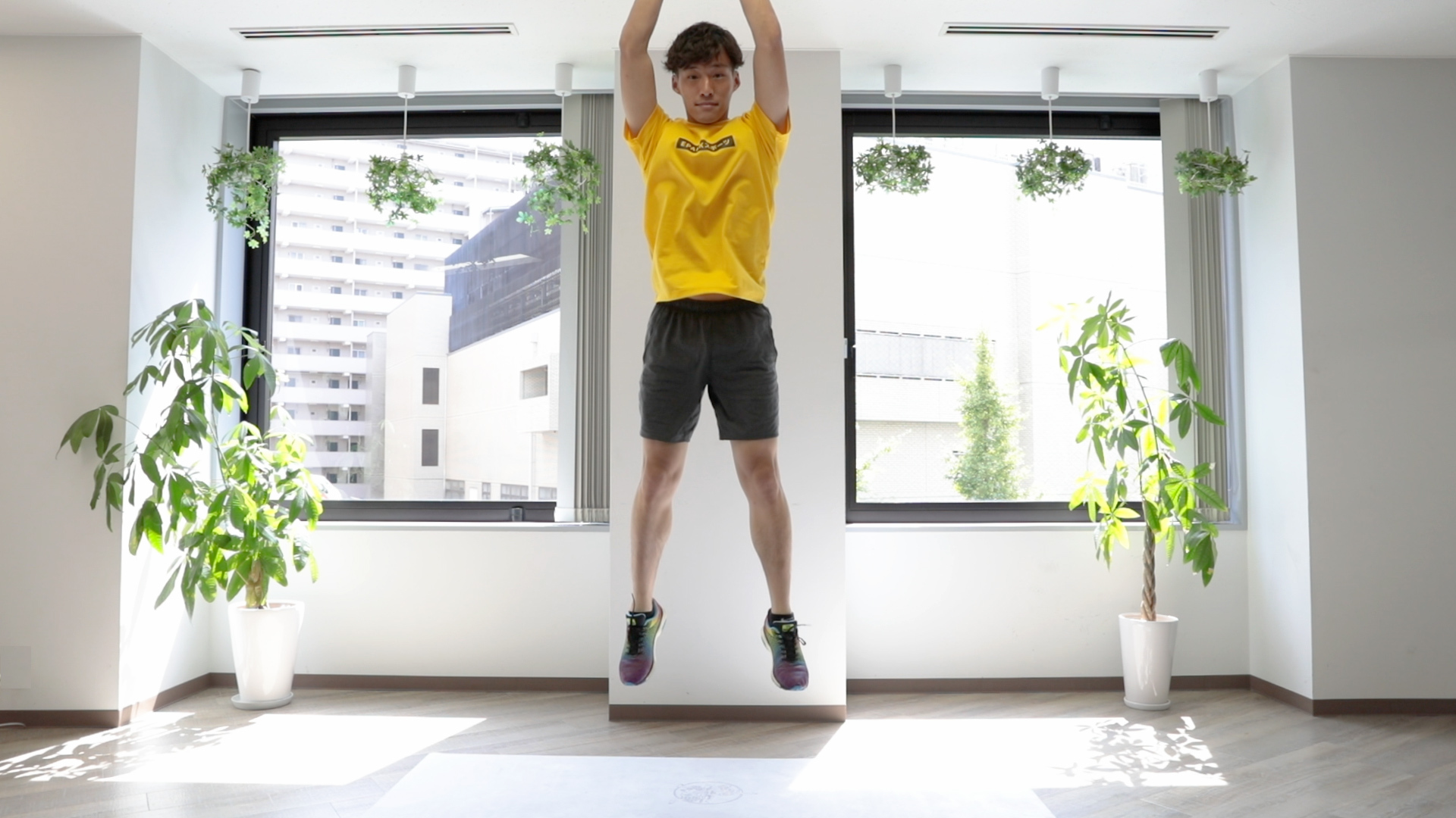 ・足を閉じてかかとを上げてしゃがみ、ジャンプと同時に手足を"大の字"に広げて戻る