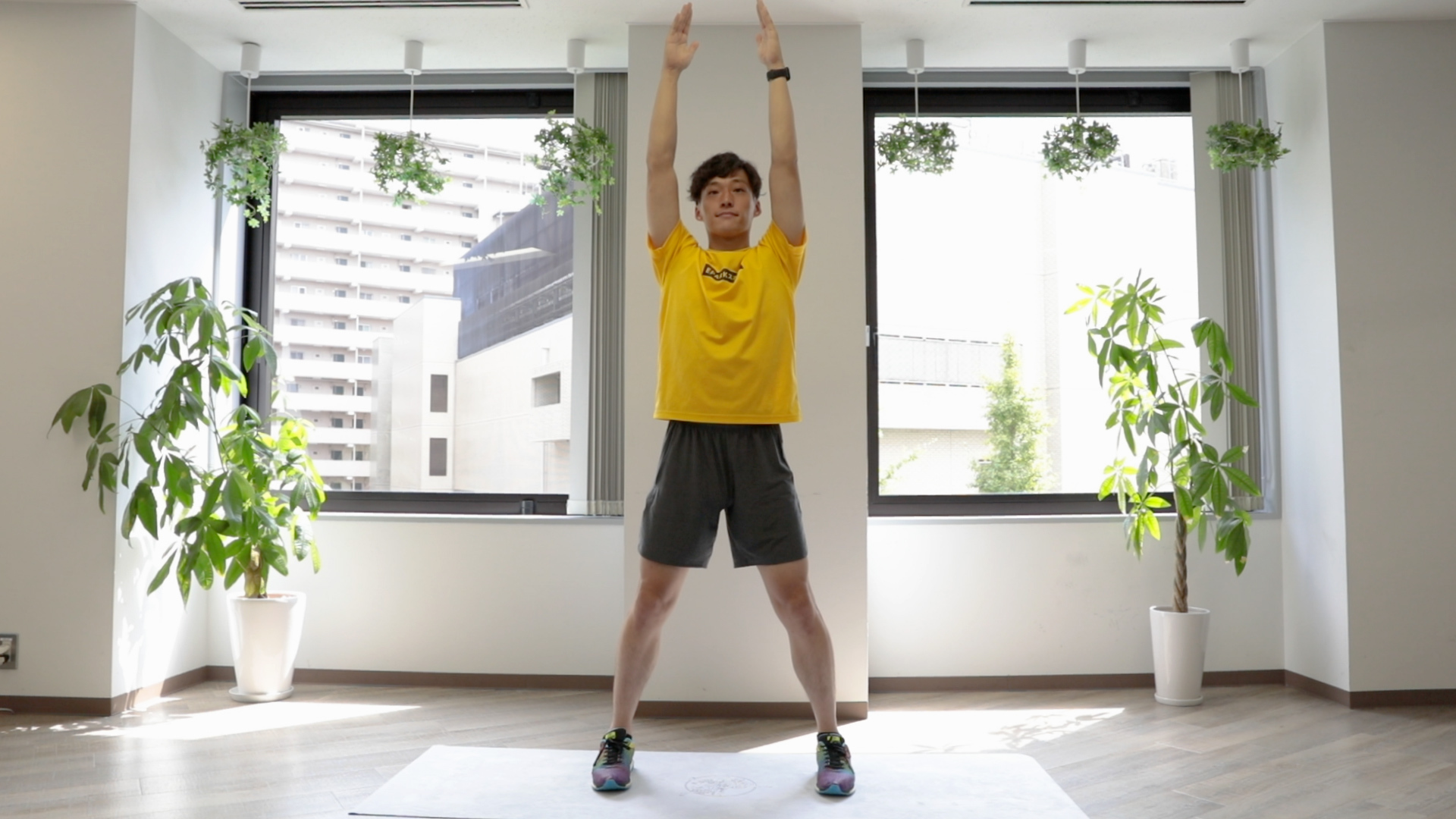 ・足は肩幅よりも少し広くとり、肘を伸ばしたまま、頭の上でバンザイをキープ