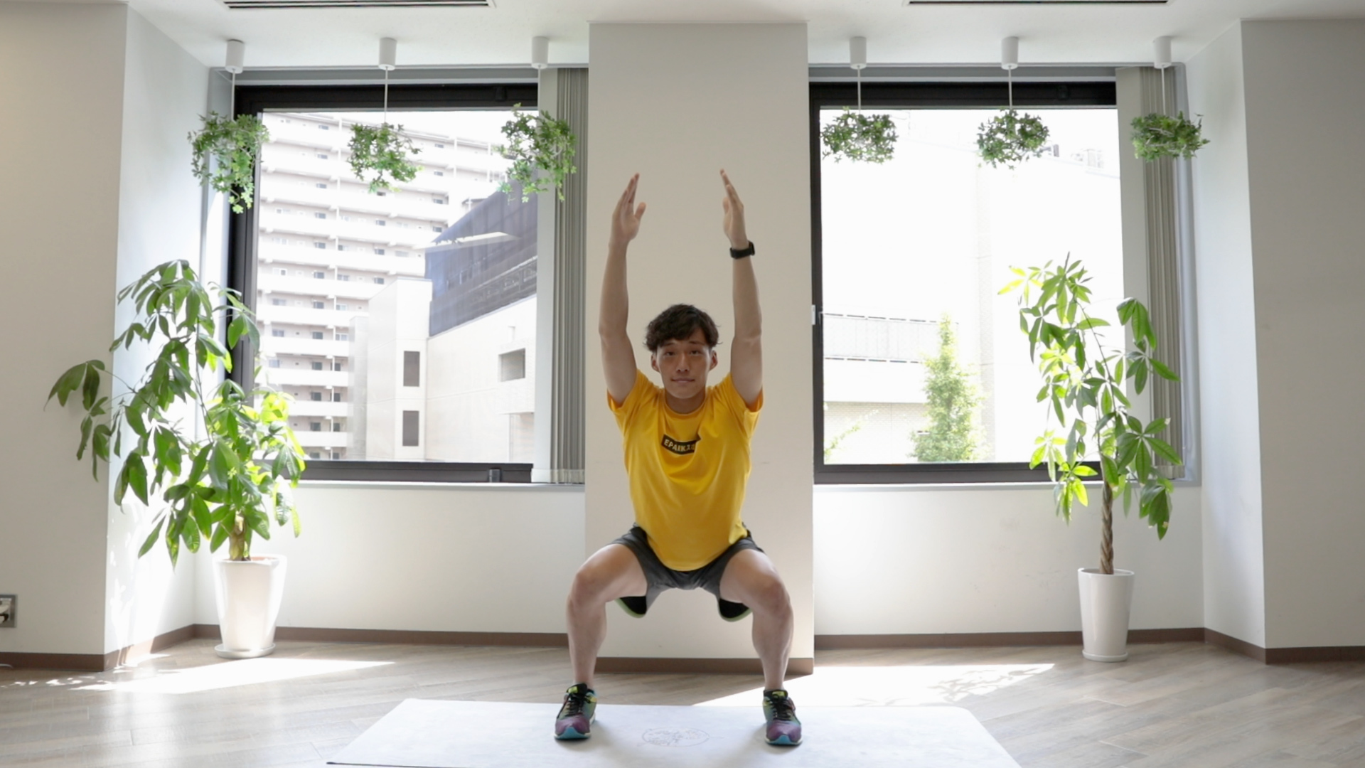 スクワットの状態からジャンプを行う「ジャンピングスクワット」。基礎体力の向上と下半身を中心に鍛えられる、スクワットを応用したトレーニングです。