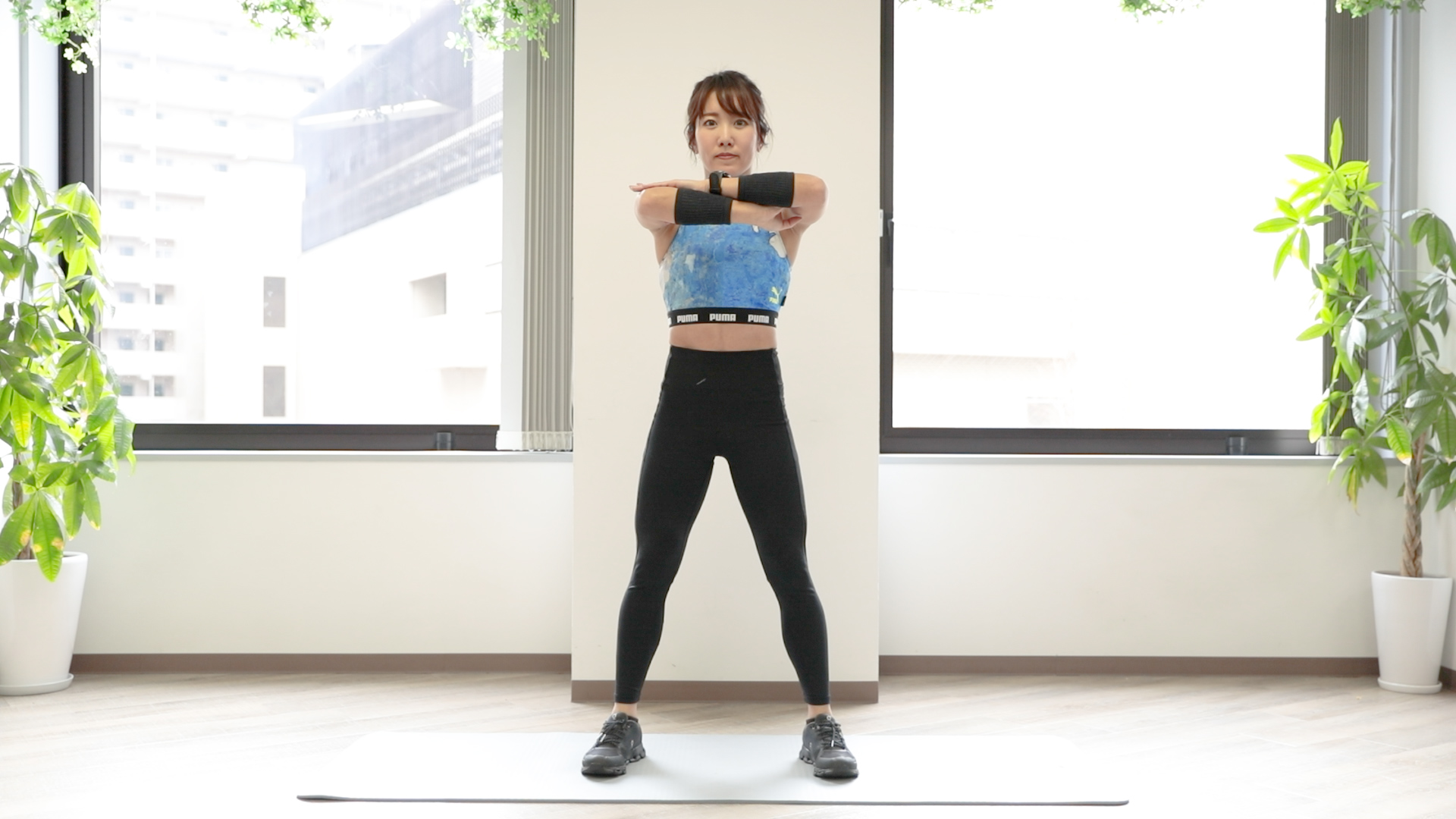・腕は体の前でクロスさせ、足は肩幅よりも少し大きくハの字に開く