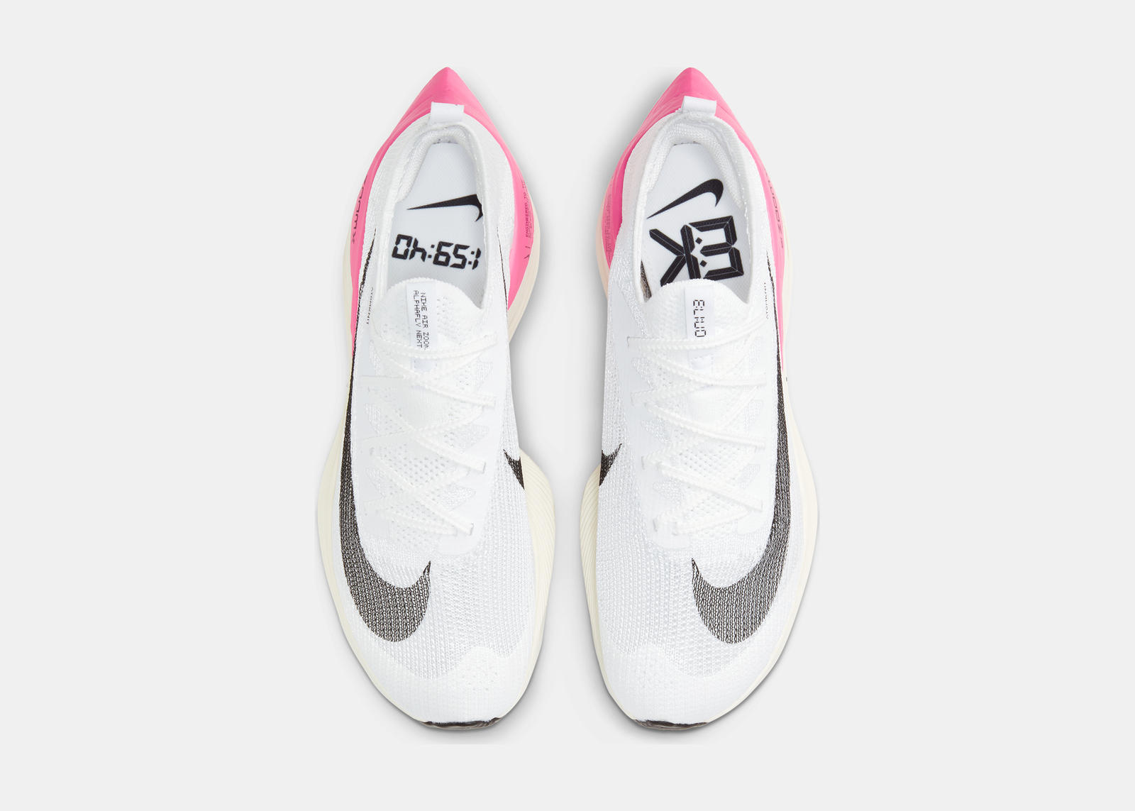 この“キプチョゲモデル”は、エリウド・キプチョゲ選手が達成した人類初のマラソン2時間切りの1周年を祝して作られたもの(2019年10月12日)。キプチョゲ選手がレースで履いていたものと同じ、白をベースにピンクがあしらわれ、ヒールやインソールにレースのタイム(1:59:40)などが記載されています。