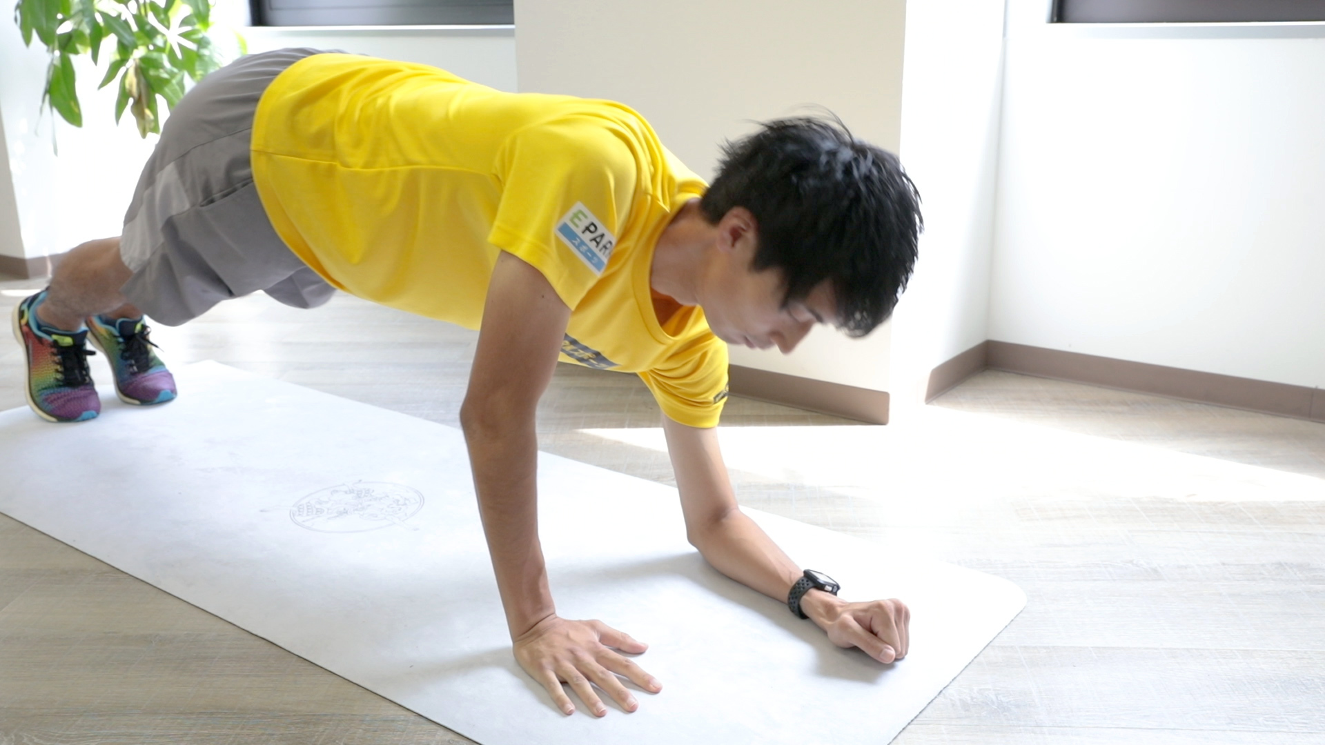 プランクとプッシュアップを応用したトレーニング「プランクプッシュアップ」。体幹だけではなく、一緒に腕まわりも鍛えられるメニューです。