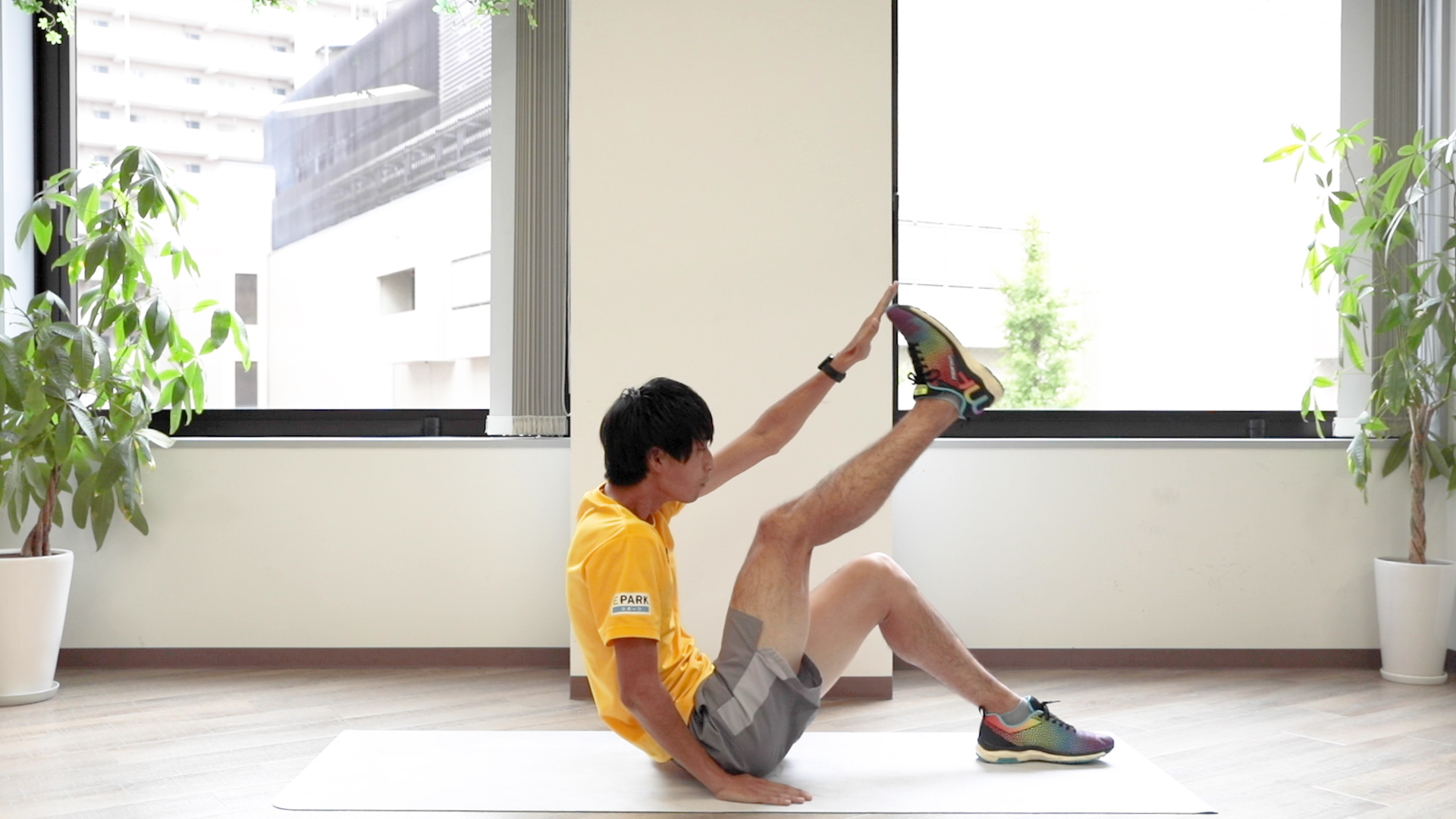 2. 右側の足と左側の手を上げて、つま先と手を合わせる