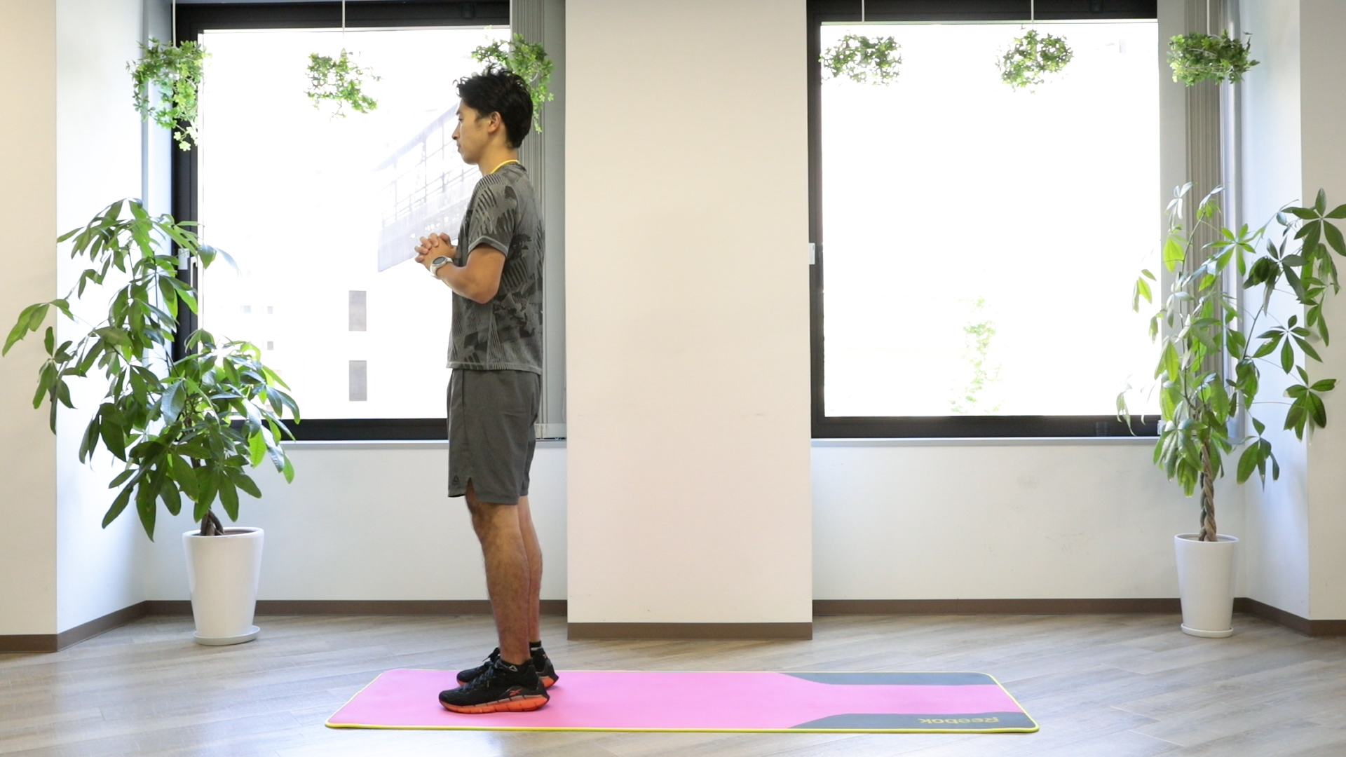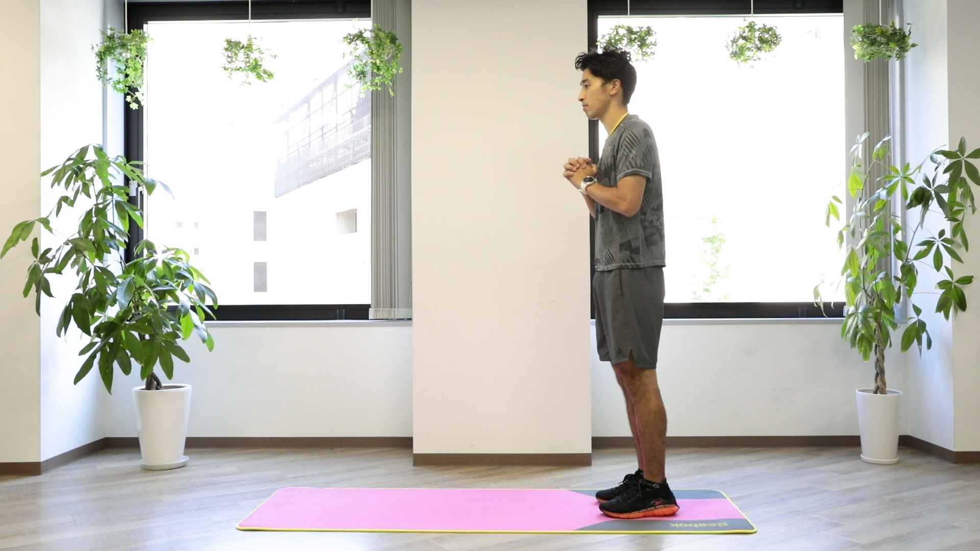 3. 前ひざを90度まで曲げたら、ゆっくりと元の姿勢に戻る